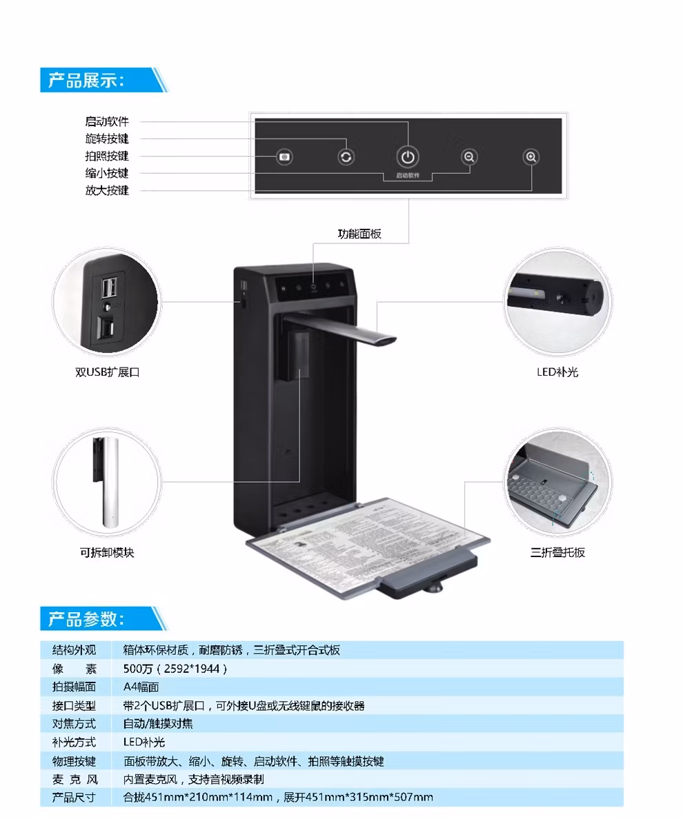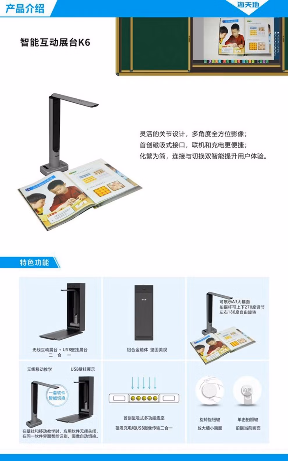 商品名称:海天地 Soopen/ 视频展台高拍仪高清壁挂式 500万/800万/1300像素实物投影无线扫描仪 K6-S 官方标配