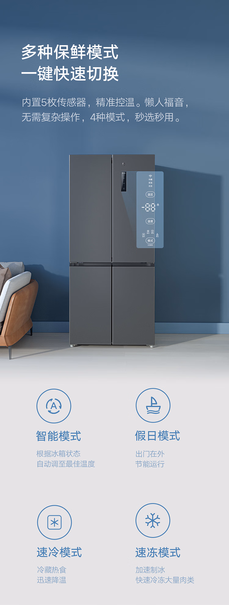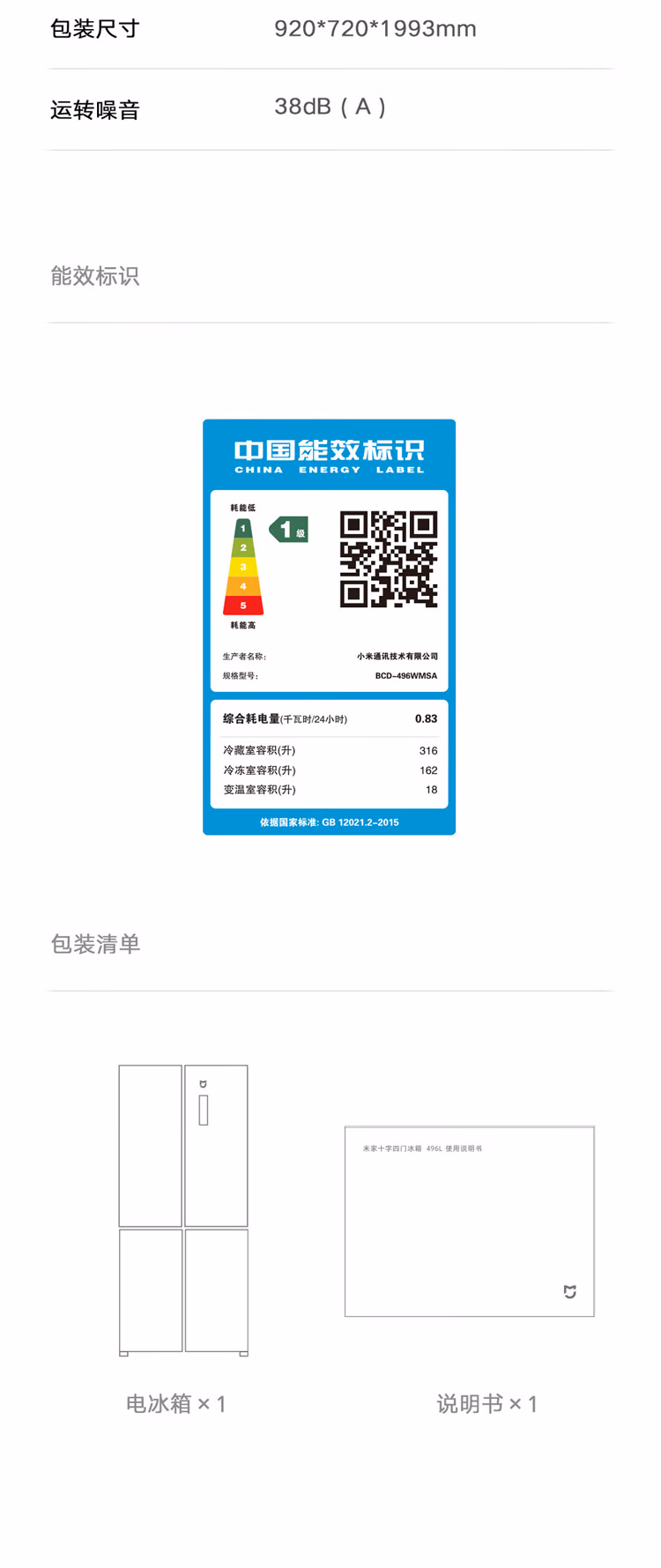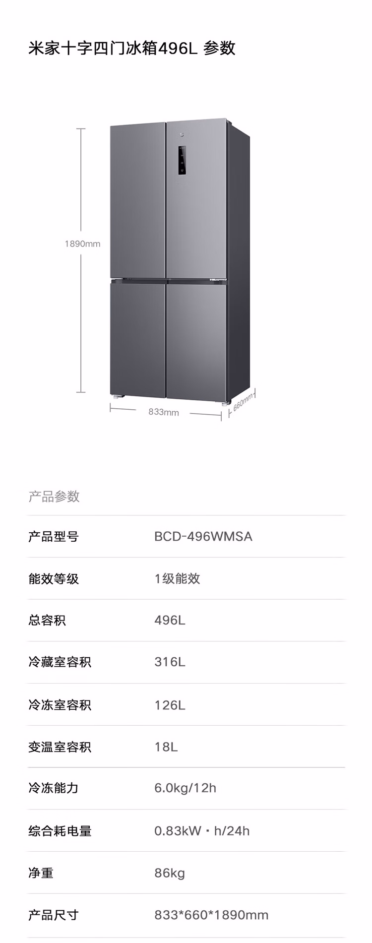 商品名称:小米(MI)米家风冷十字四门冰箱 496L