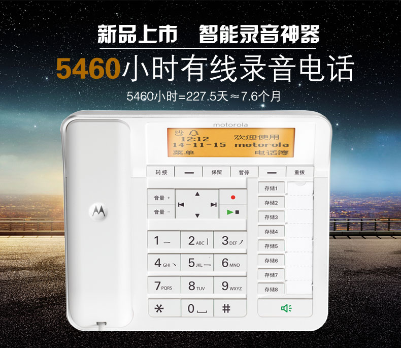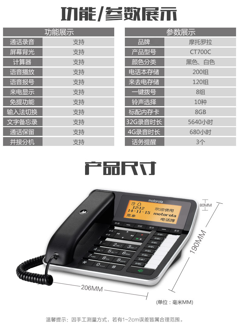 商品名称:摩托罗拉 录音电话 CT700C 206*190*80mm 5460小时录音