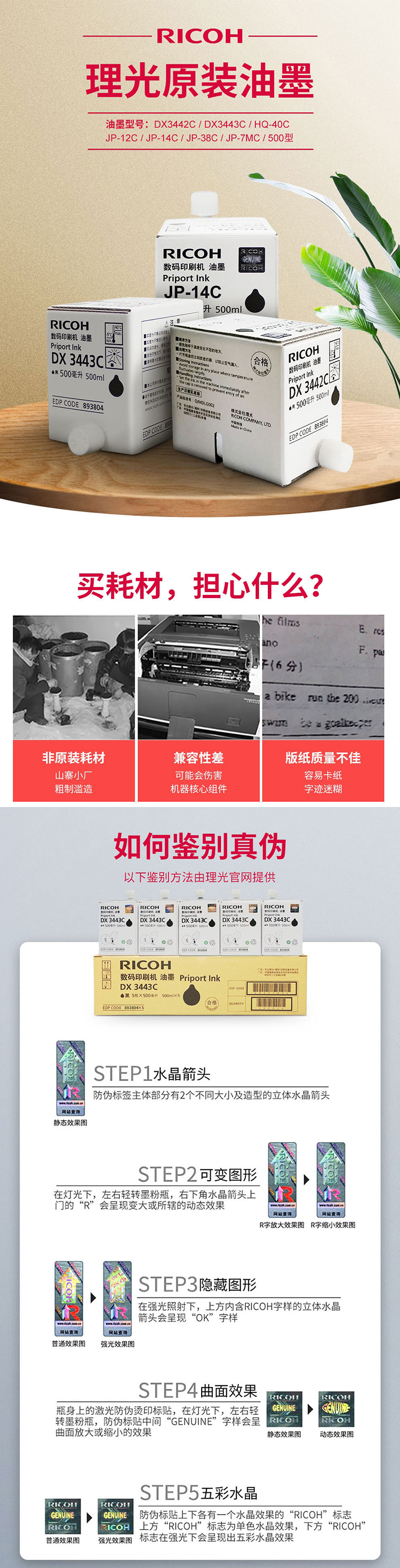 商品名称:理光 数码印刷机 油墨 JP-14C 500ml*5瓶 适用于理光P785C DX3440c 基士得耶CP 6200C 6300C 黑色