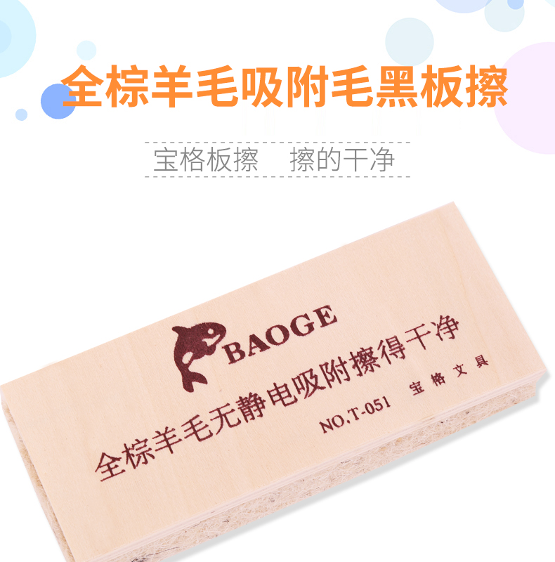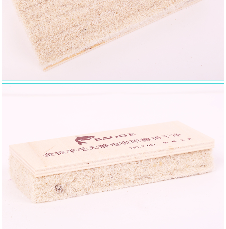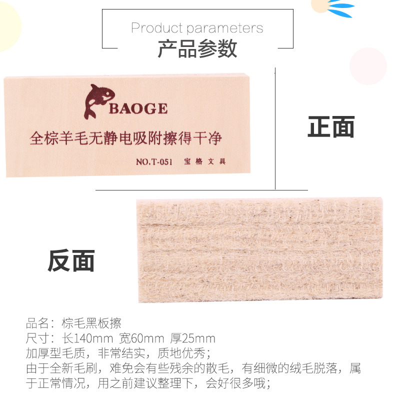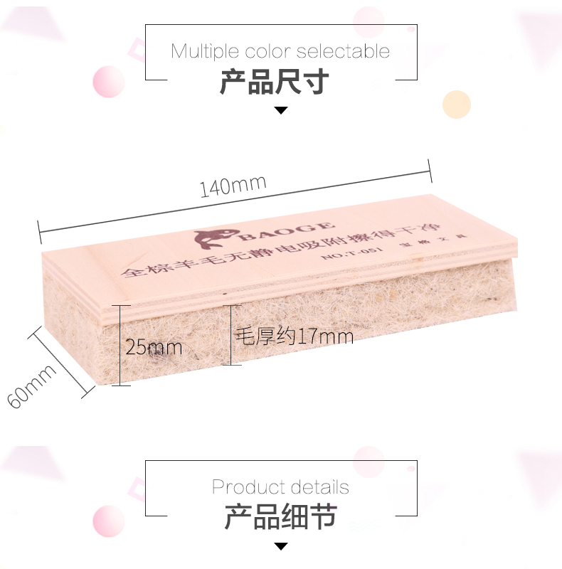 商品名称:宝格 黑板擦 T-051 不带磁性 全棕羊毛无静电 14*5.8*2.3cm