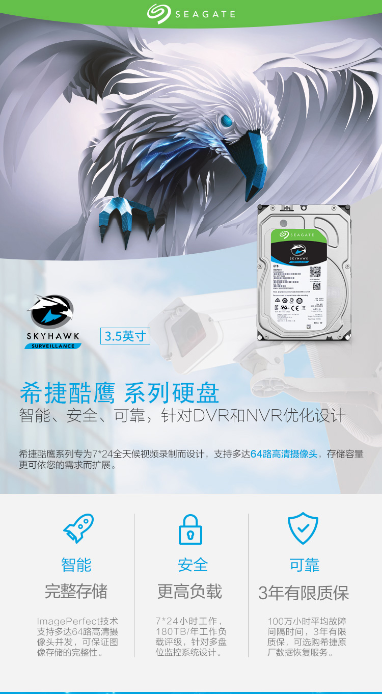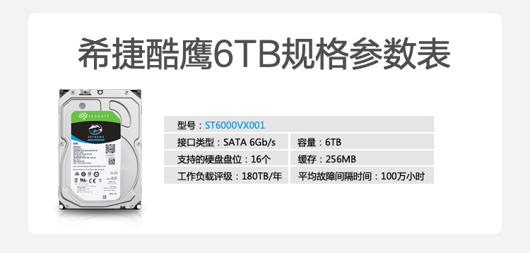 商品名称:希捷(SEAGATE) SATA3接口 监控级硬盘 硬盘录像机大华 海康监控 希捷6TB (ST6000VX001)