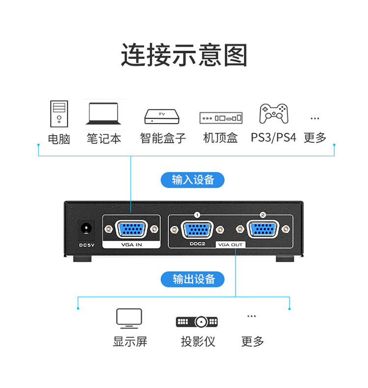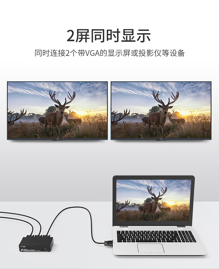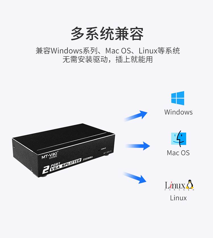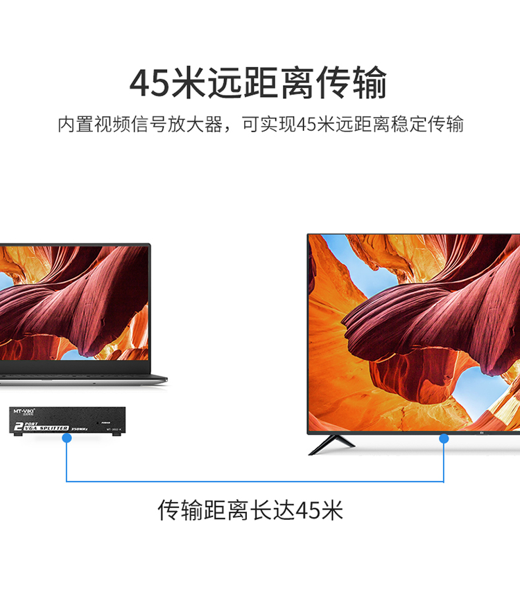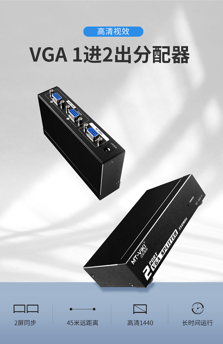 商品名称:迈拓维矩/MT-VIKI VGA分配器 MT-3502-K 高清VGA接口 一分二 视频扩展分屏器 1进2出 传输距离45m 黑色