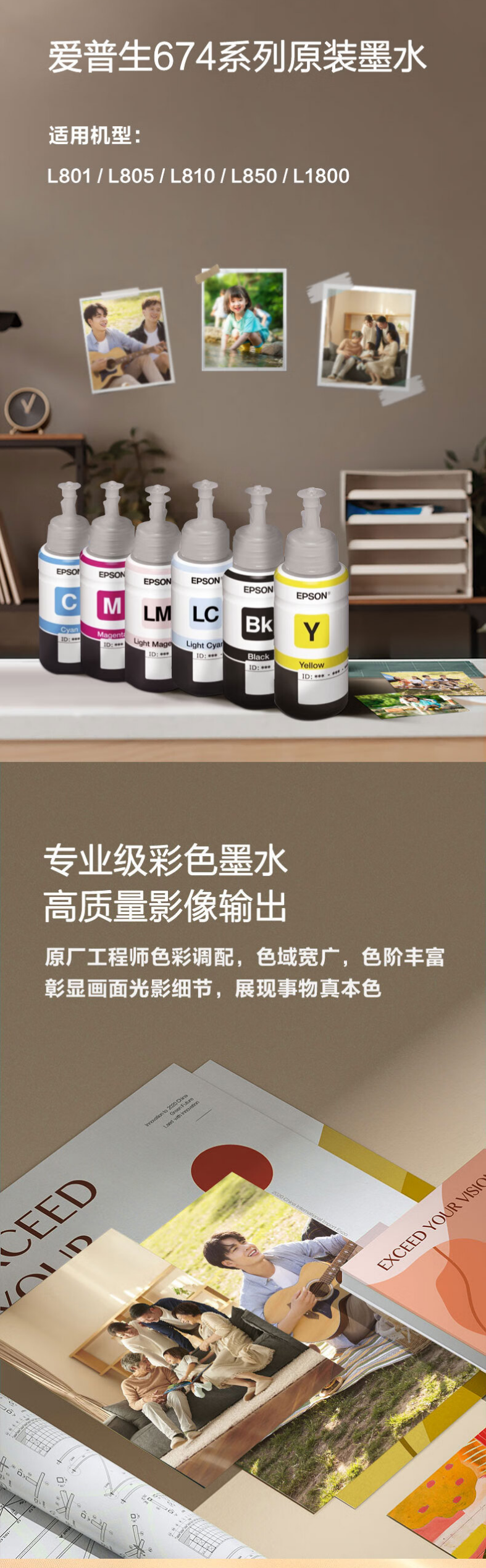 商品名称:爱普生 T6741墨水适用L801/L805/L810/L850/L1800 674-6色整套 原装 如图 0.645KG