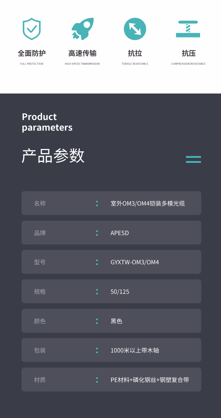 商品名称:APESD室外多模万兆 光缆国标铠装电信级光纤线缆 【6芯】单米价